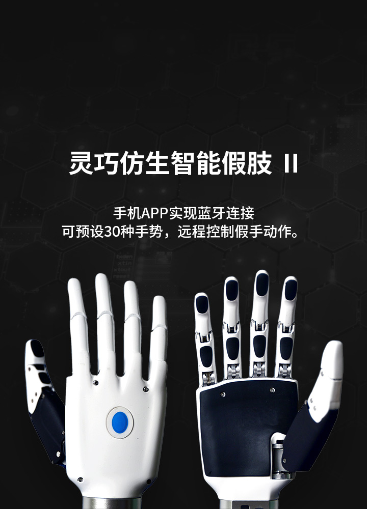 每個(gè)手指單獨(dú)驅(qū)動(dòng),動(dòng)作靈活精準(zhǔn);手指關(guān)節(jié)彈力緩沖裝置,手感舒適,防碰撞;掌部和手指表面的耐磨材料具有防滑功能,抓握可靠;采用航空材料,重量輕,牢固美觀;每個(gè)手指驅(qū)動(dòng)集成壓力、位置、速度等傳感器及反饋控制;拇指具有3個(gè)自由度;多模式控制,藍(lán)牙4.0連接。